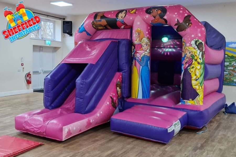 This fantastic princess disco bouncy castle in pink is one of the most impressive disco castles we hire in Sheffield, Chesterfield and Rotherham. It has lovely princess artwork all across the front and down the side of the slide. This is sure to be a big hit for a little girls birthday celebration.