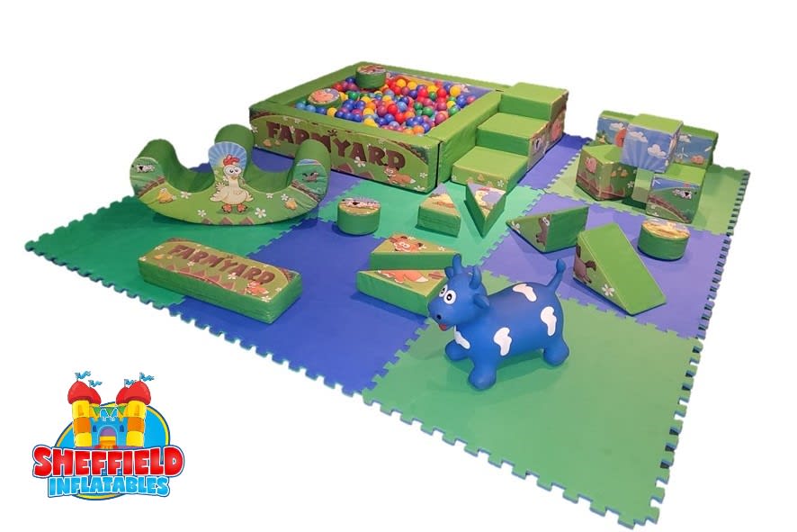 You will receive a ball pit with over 200 balls, 17 different sized shapes, a foam see-saw and a ride-on inflatable animal. We can lay the foam matting into any shape to accommodate different sized venues in Sheffield, Chesterfield and Rotherham.