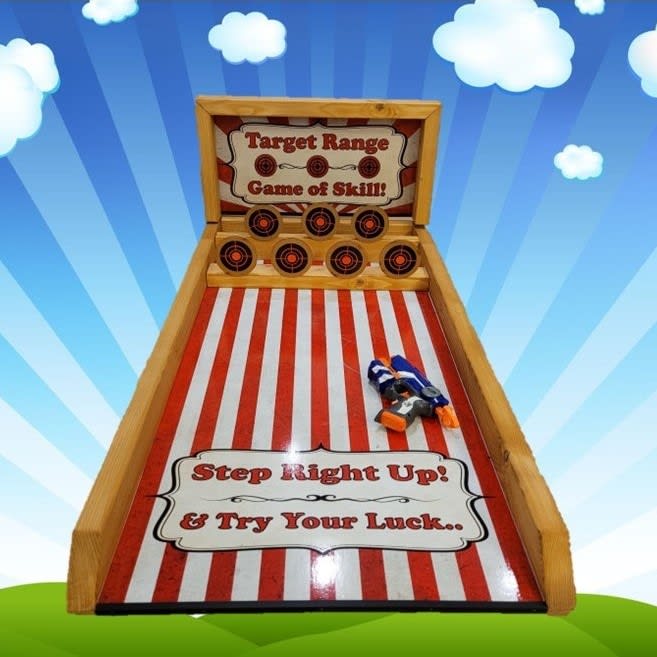 Our tabletop Target Range Game is designed with the ultimate fun experience in mind. Featuring a sturdy wooden construction, this game includes 8 challenging knock-down targets that test your aim and precision. Guests can take turns to see who can hit the most targets using the included Nerf gun and bullets. It's a fantastic way to keep the kids (and adults) entertained and engaged throughout your event.