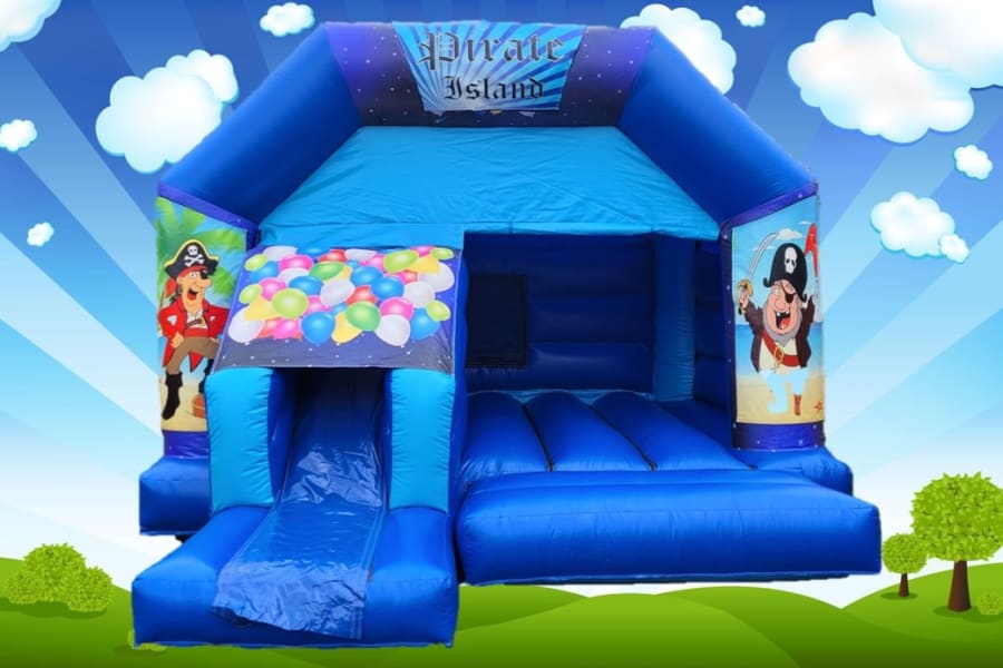 A great sized bouncy castle for a larger birthday celebration, it features pirate artwork on the pillars and a high slide for extra fun.