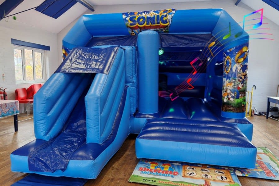 Bring the sparkle and speed to your event with our Large Sonic Disco Bouncy Castle. This 14ft x 17ft inflatable (space needed 16ft x 22ft) packs a high front slide, built-in disco ball and a Bluetooth music system so you can connect your phone and DJ the party. Perfect for family birthdays, school fetes or events in Chesterfield and Sheffield ✨🎶
